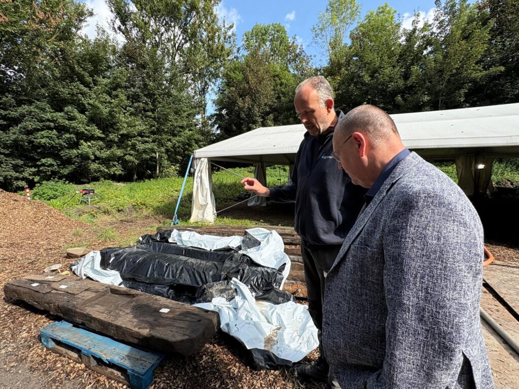 Tussen het gras en klei stond ik oog in oog met het wrak van een eeuwenoud waterschip. Studenten en onderzoekers waren daar bezig met het laatste onderzoek ooit aan dit schip – een stukje geschiedenis dat daarna weer voorgoed onder de grond verdwijnt.